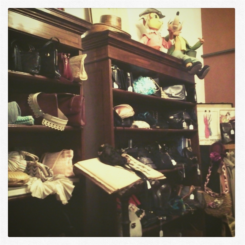 Dans une première salle, toute en longueur, lustres et bibelots se font concurrence.  Au bout, il faut avoir l’œil pour repérer un étroit couloir menant  à la partie « vêtements vintage » de la boutique. Tout est classé par thème: sacs, chaussures, robes, puis par couleur. A-do-rable.
