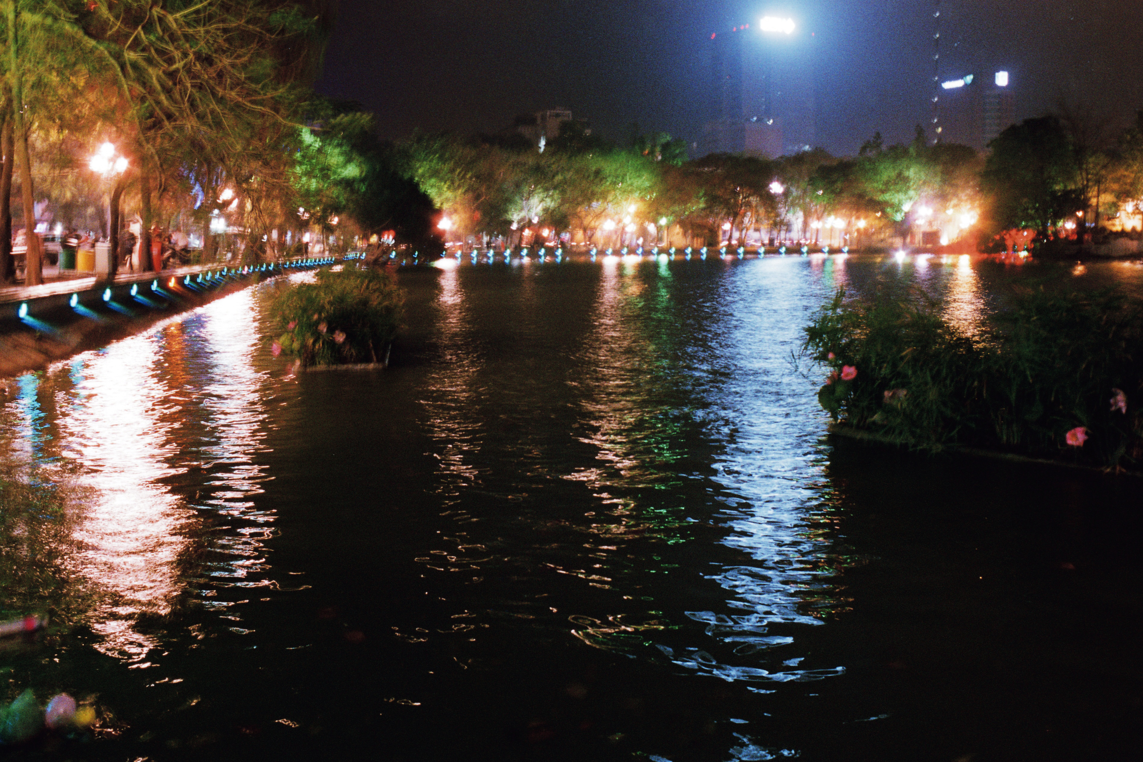 Les lumières s’allument, les habitants se promènent ou s’installent dans les bars alentours, les voyageurs viennent admirer la Pagode de la tortue, posée au centre du lac.