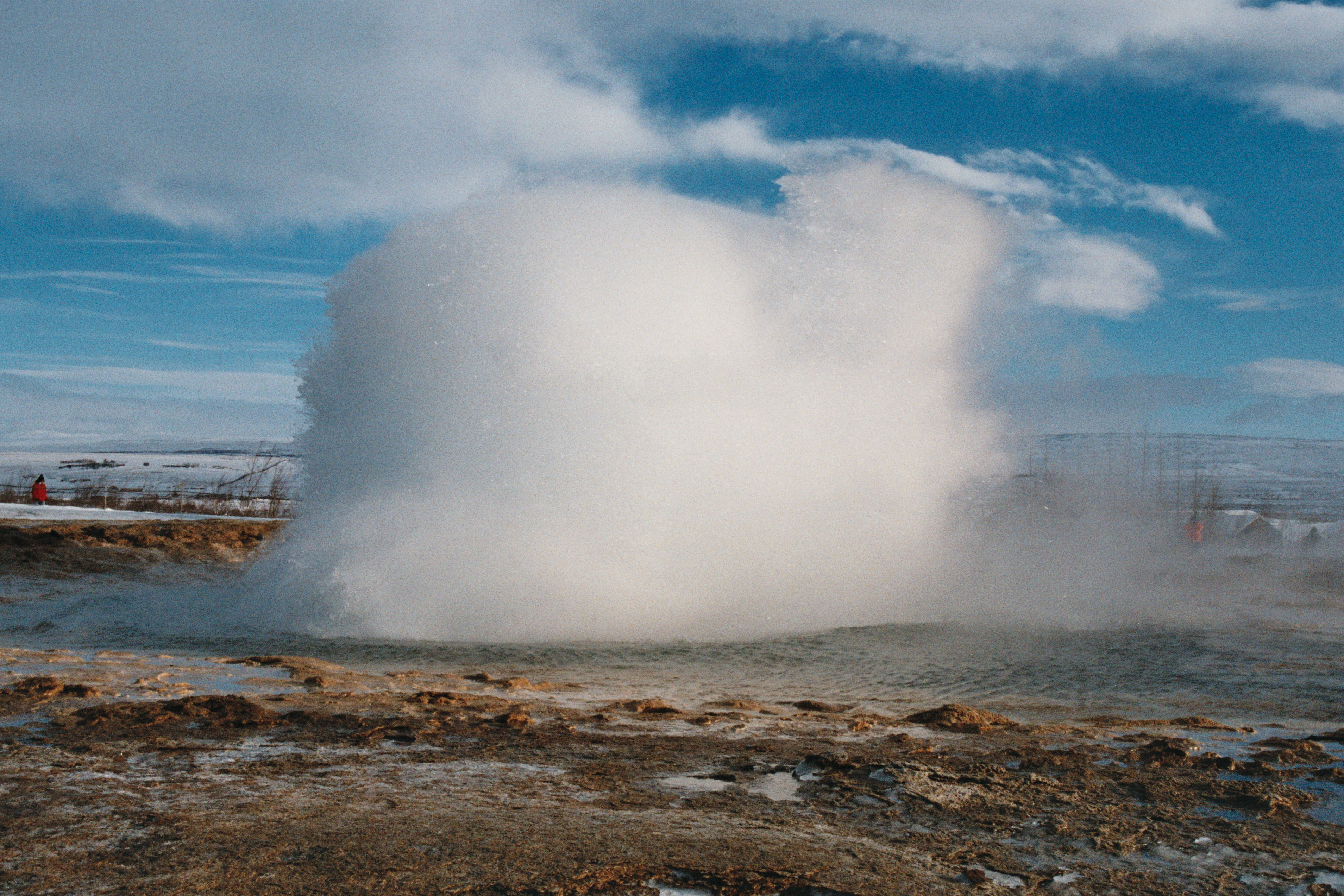 Le blanc est partout, sur les montages, la lave, les plaines, les toits, les parcs et même les routes… jusqu’à l’approche de sources chaudes ou de geysers. La couverture fond alors pour laisser place à une eau à plus de 100°C, défiant les températures extérieures.