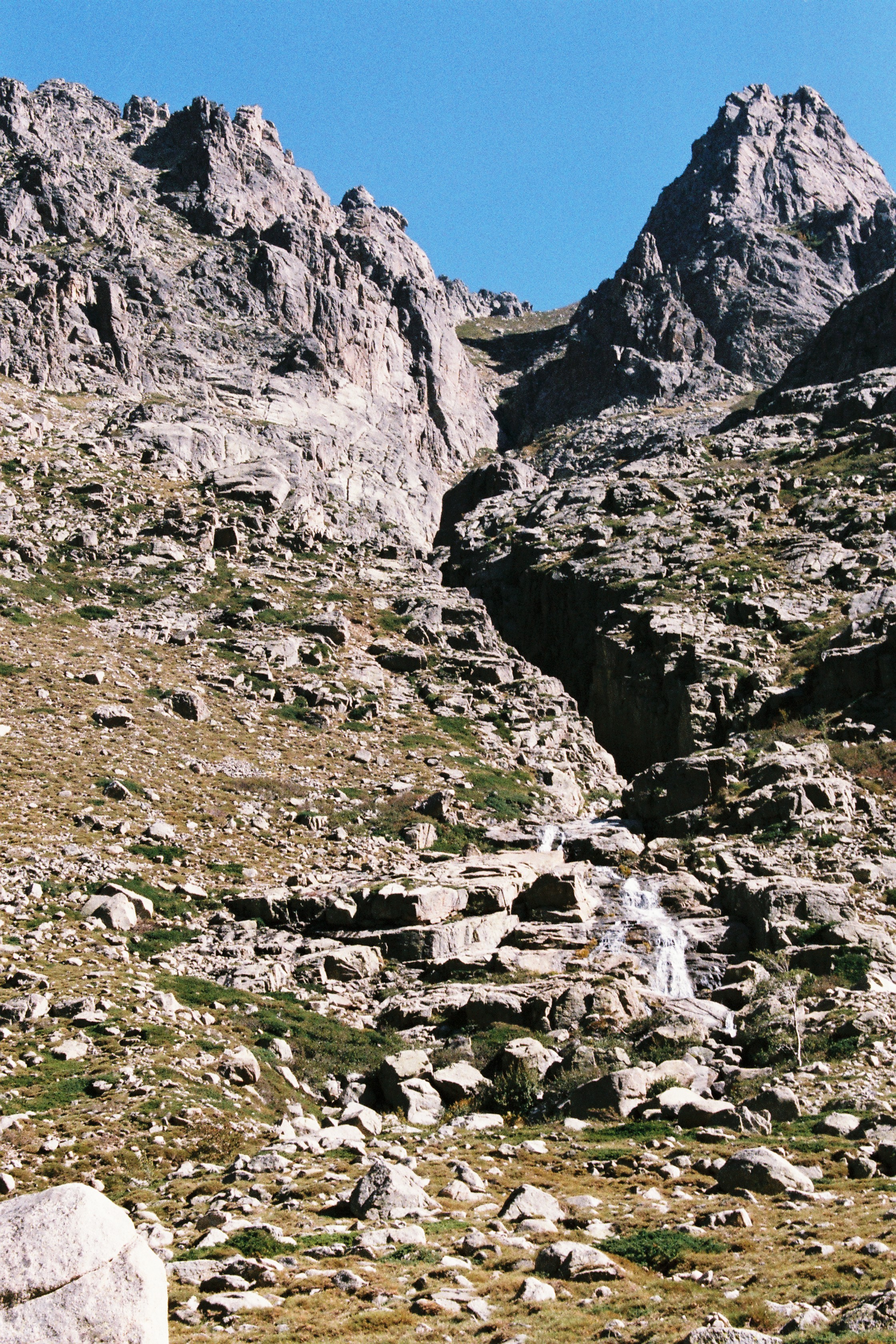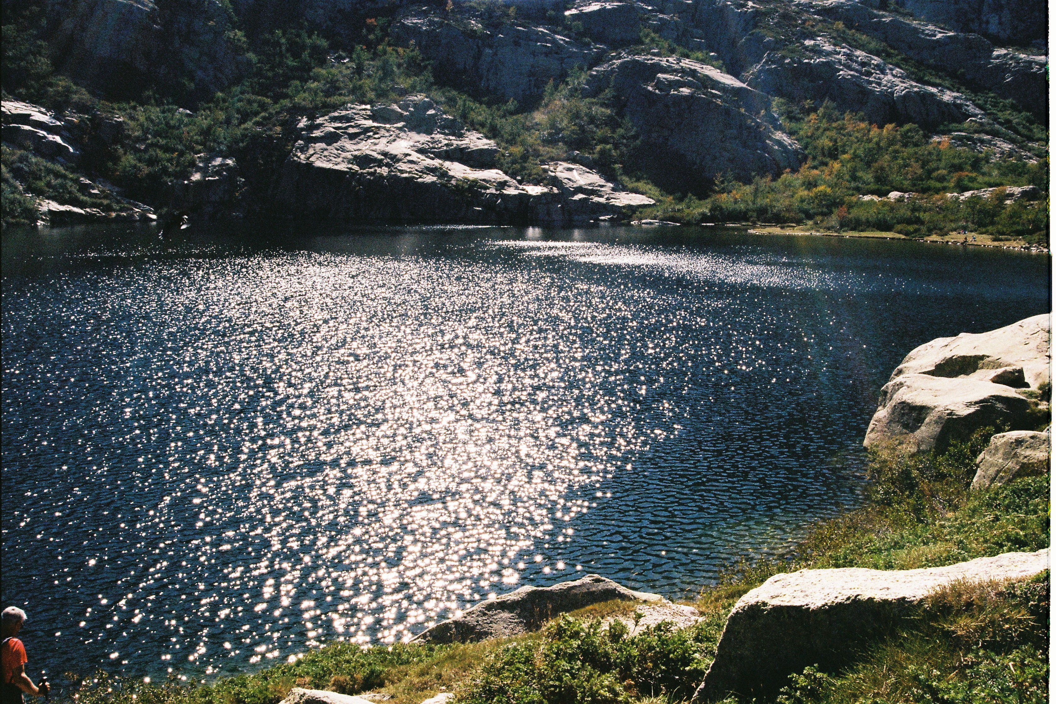 Ci-dessus: le terrain rocheux de la vallée de la Restonica et les reflets du soleil sur le lac de Melo.