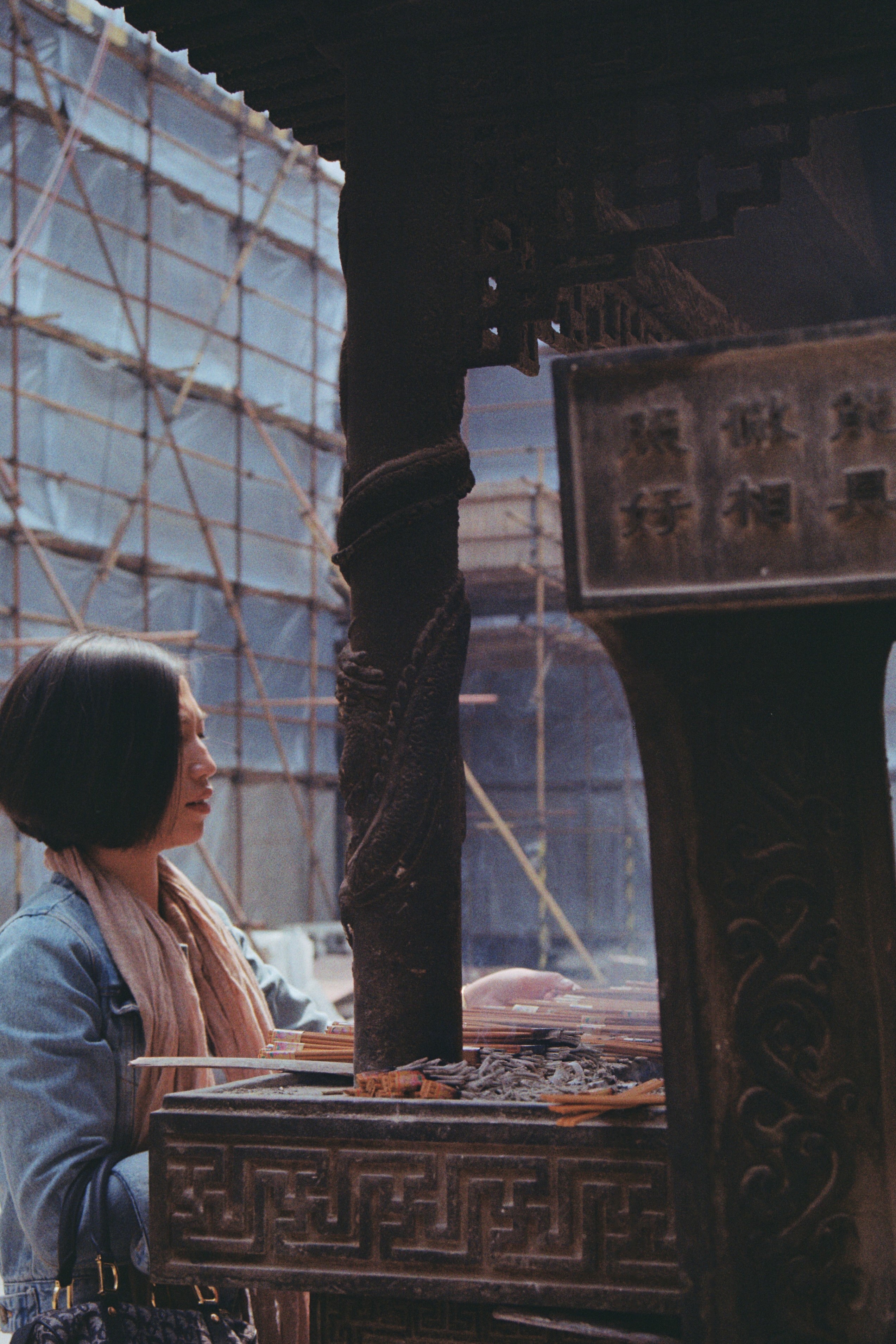 Ci-dessus: Une des façades externe au milieu des gratte-ciel et une jeune femme brûlant de l’encens au sein du temple.